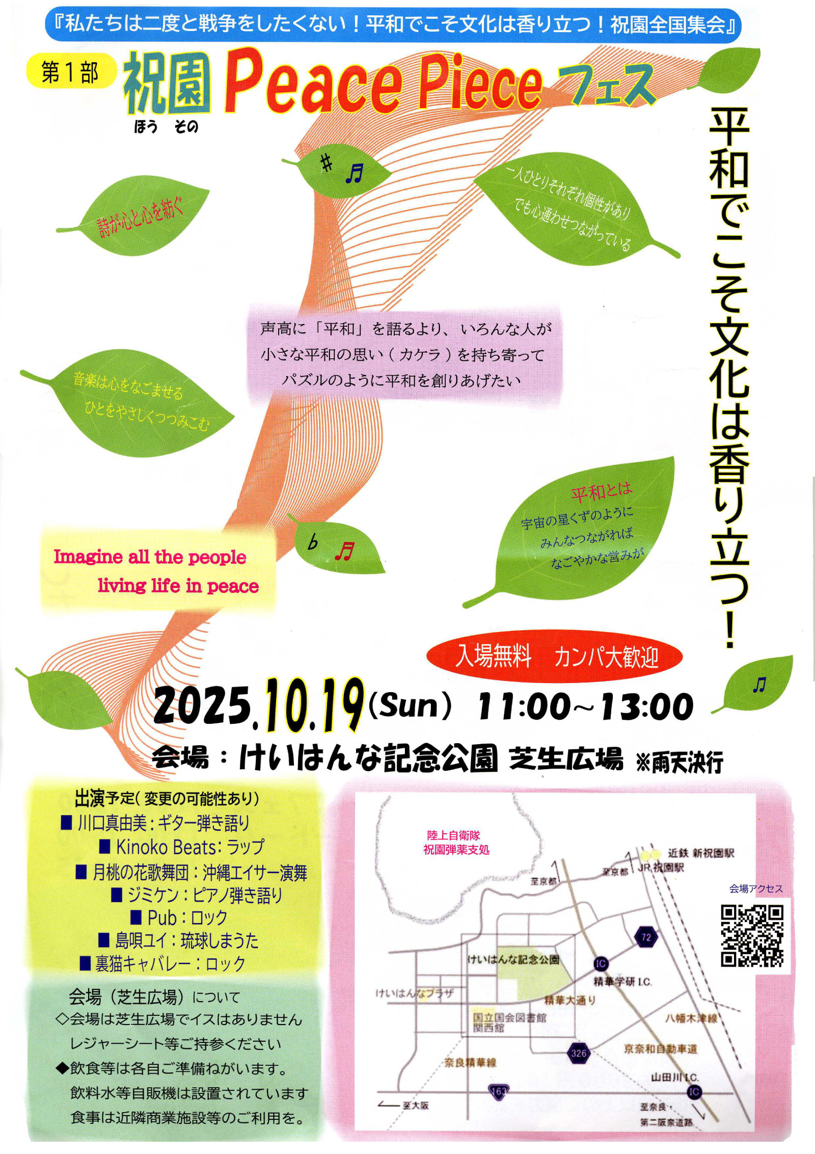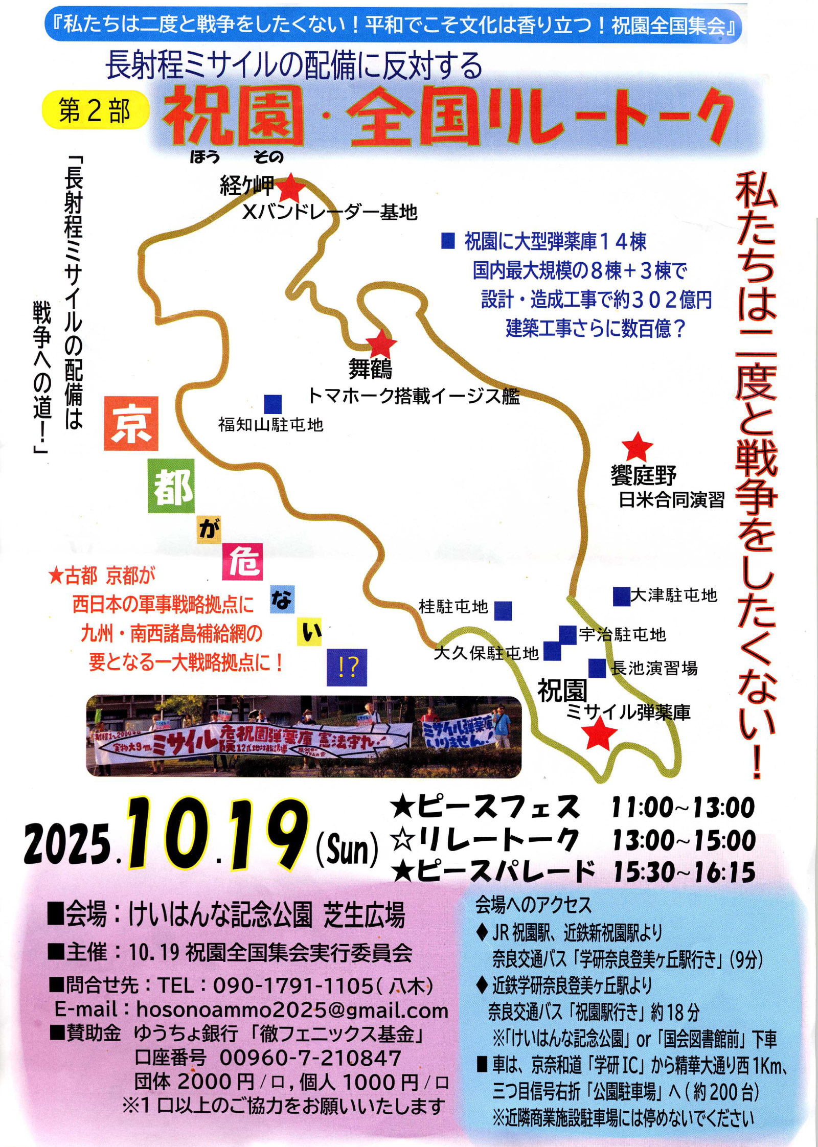 とりくみ案内 長射程ミサイルの配備に反対する 祝園・全国リレートーク 2025.09.25 ◆『私たちは二度と戦争をしたくない!平和でこそ文化は香り立つ!祝園全国集会』◆日時:10月19日(日)11:00~16:15(パレード終了)けいはんな記念公園・芝生広場 (印刷用PDFファイル)