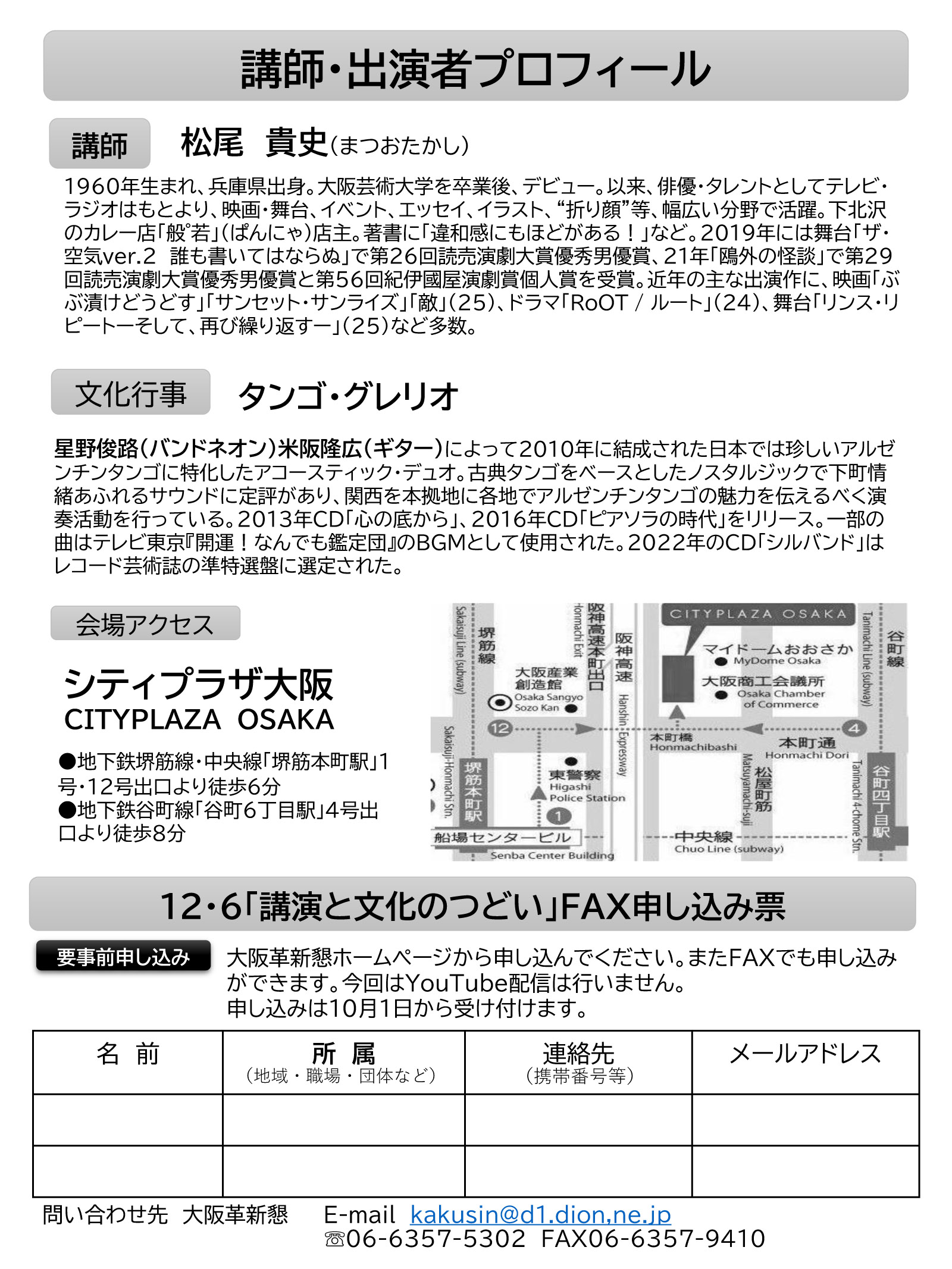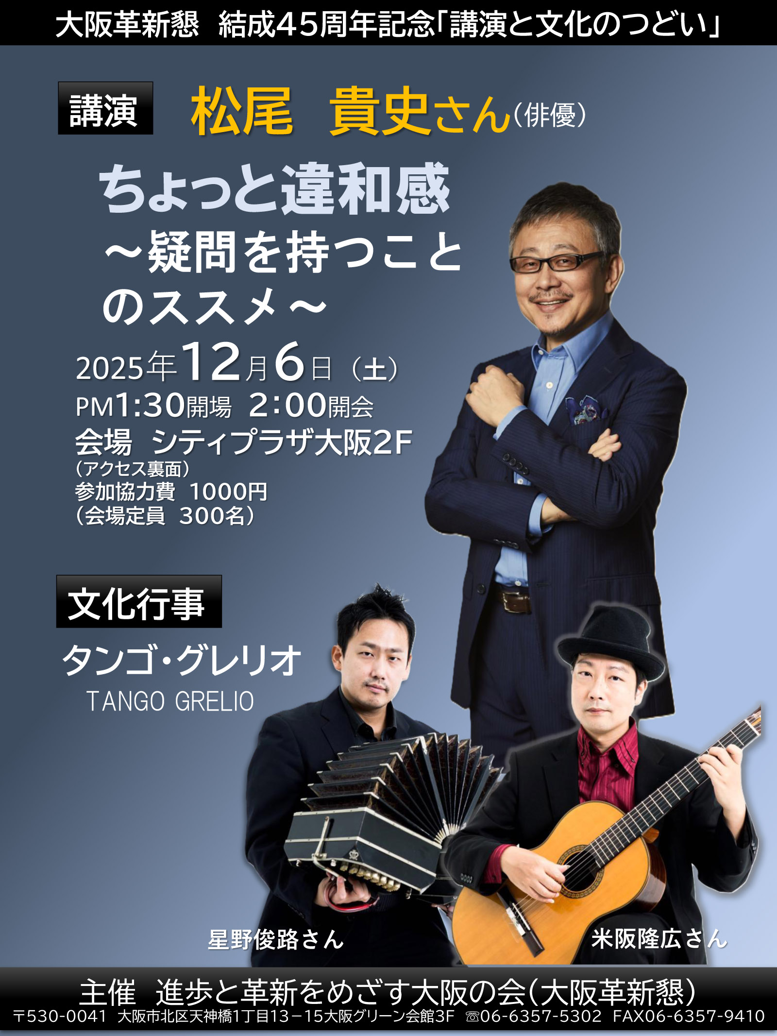 とりくみ案内 大阪革新懇 結成45周年記念「講演と文化のつどい」 2025.09.25 ◆日時:2025年12月6日(土) 13:30開場 14:00開会◆会場:シティプラザ大阪2F◆講演:松尾 貴史 さん(俳優)「ちょっと違和感~疑問を持つことのススメ~」◆文化行事:タンゴ・グレリオ◆参加費 1000円 (印刷用PDFファイル)