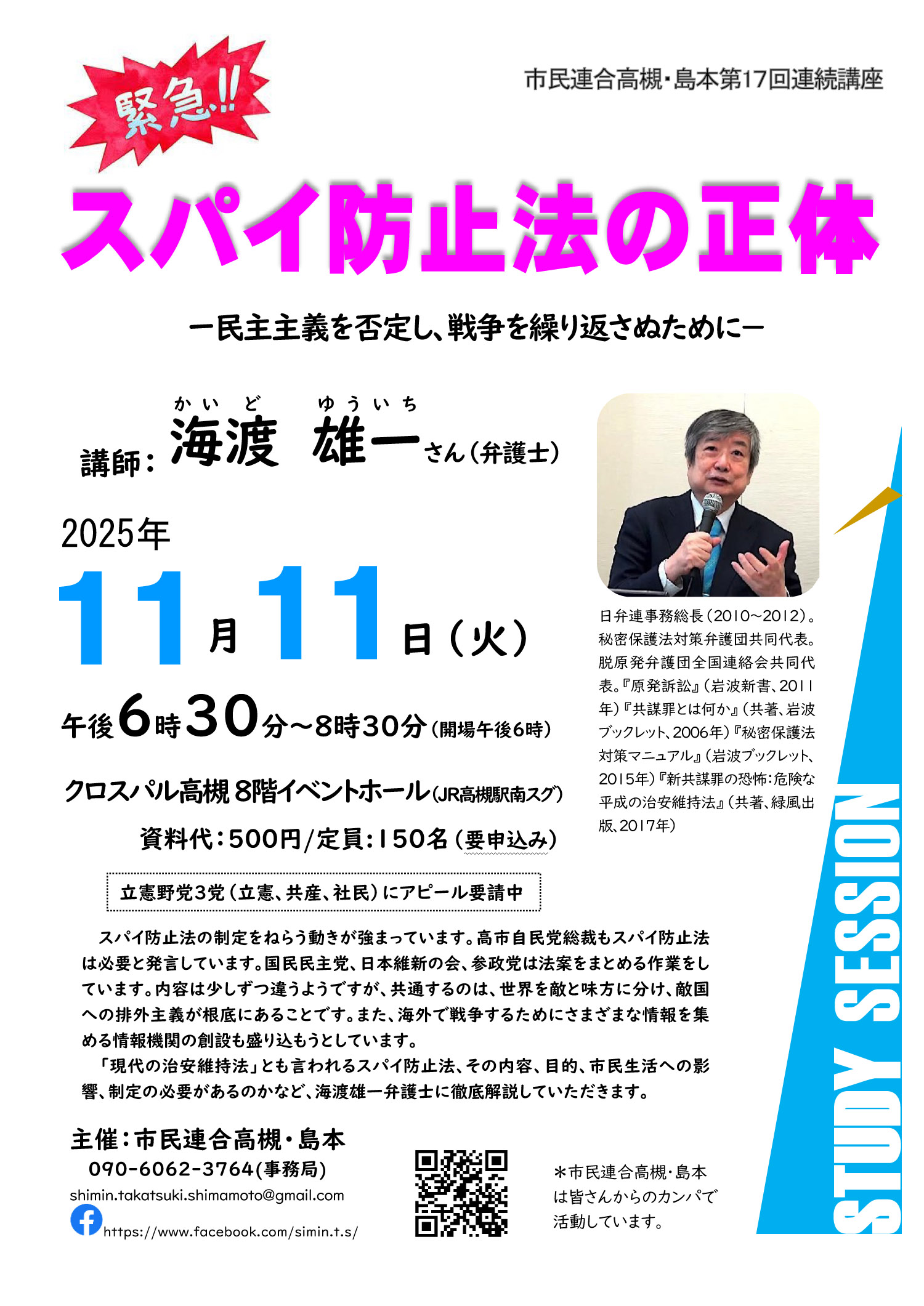 とりくみ案内 「スパイ防止法の正体」~民主主義を否定し、戦争を繰り返さぬために 2025.10.27 ◆市民連合高槻・島本第17回連続講座◆講師 海渡 雄一さん(弁護士)◆2025年11月11日(火)18:30~ クロスパル高槻8階イベントホール 資料代500円 (印刷用PDFファイル)