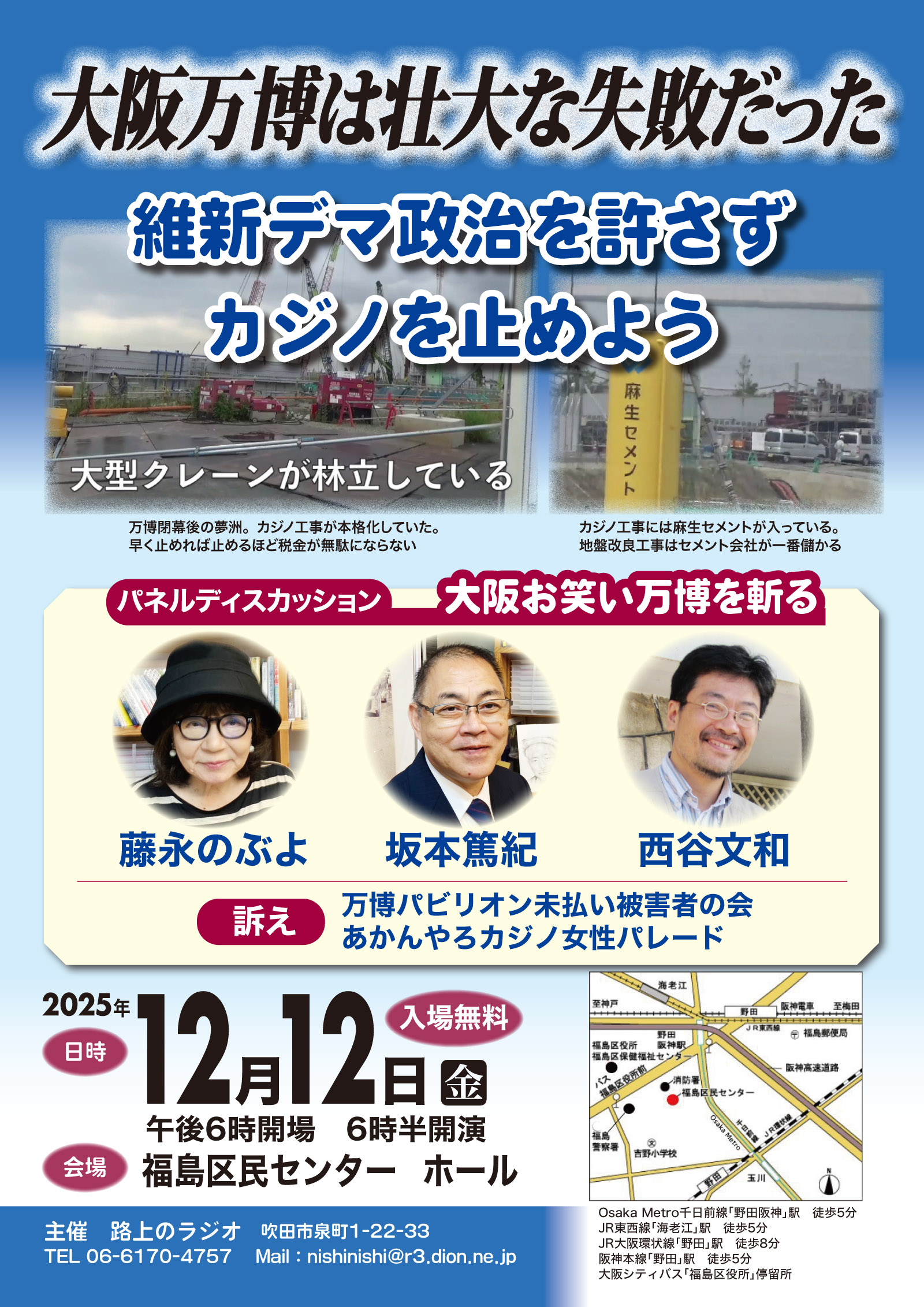 とりくみ案内 大阪万博は壮大な失敗だった―維新デマ政治を許さずカジノを止めよう 2025.12.01 ◆パネルディスカッションー大阪お笑い万博を斬る◆出演:藤永のぶよさん、坂本篤紀さん、西谷文和さん◆訴え:万博パビリオン未払い被害者の会 あかんやろカジノ助成パレード◆日時:2025年12月12日(金)福島区民センターホール◆主催:路上のラジオ (入場無料) (印刷用PDFファイル)