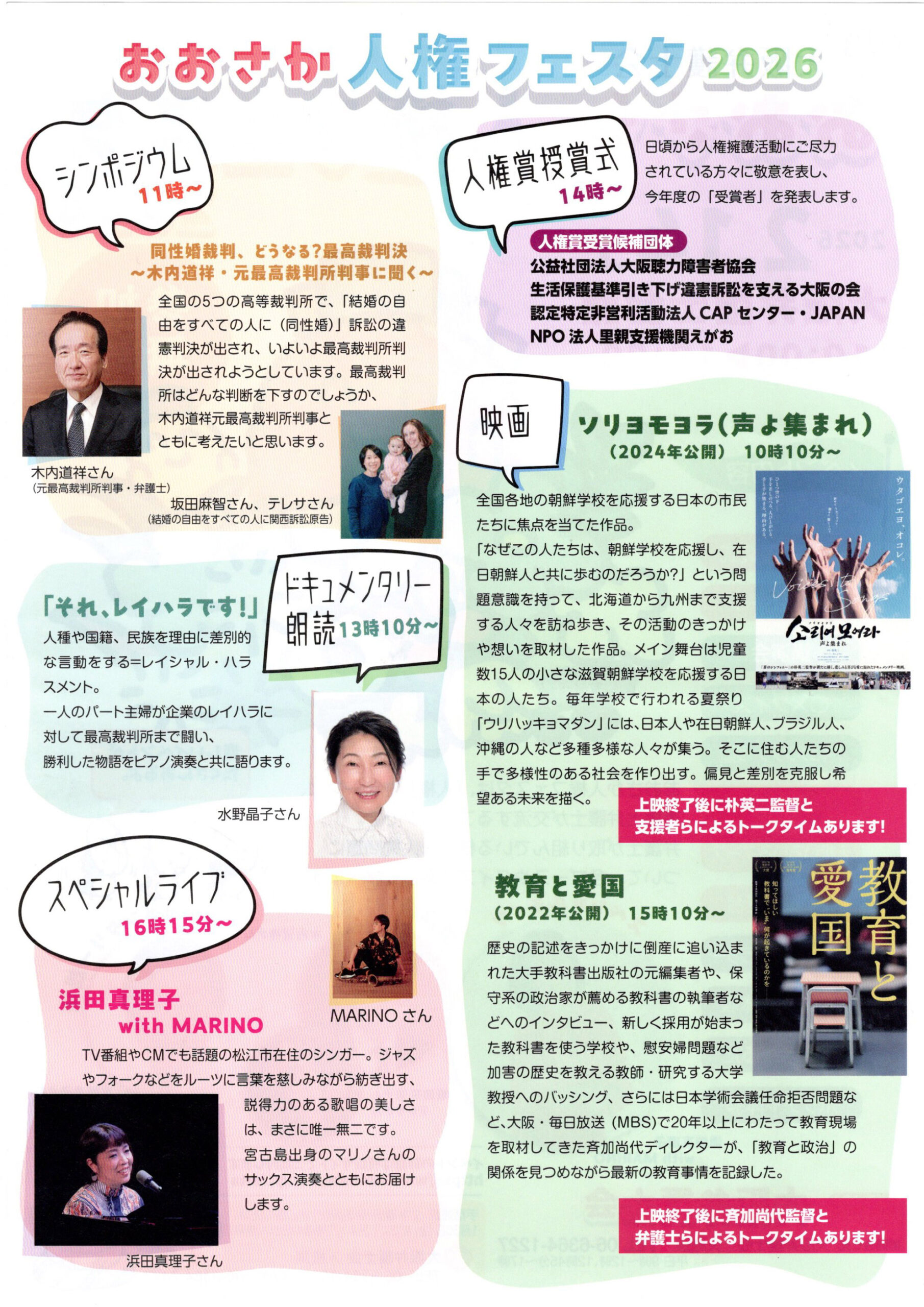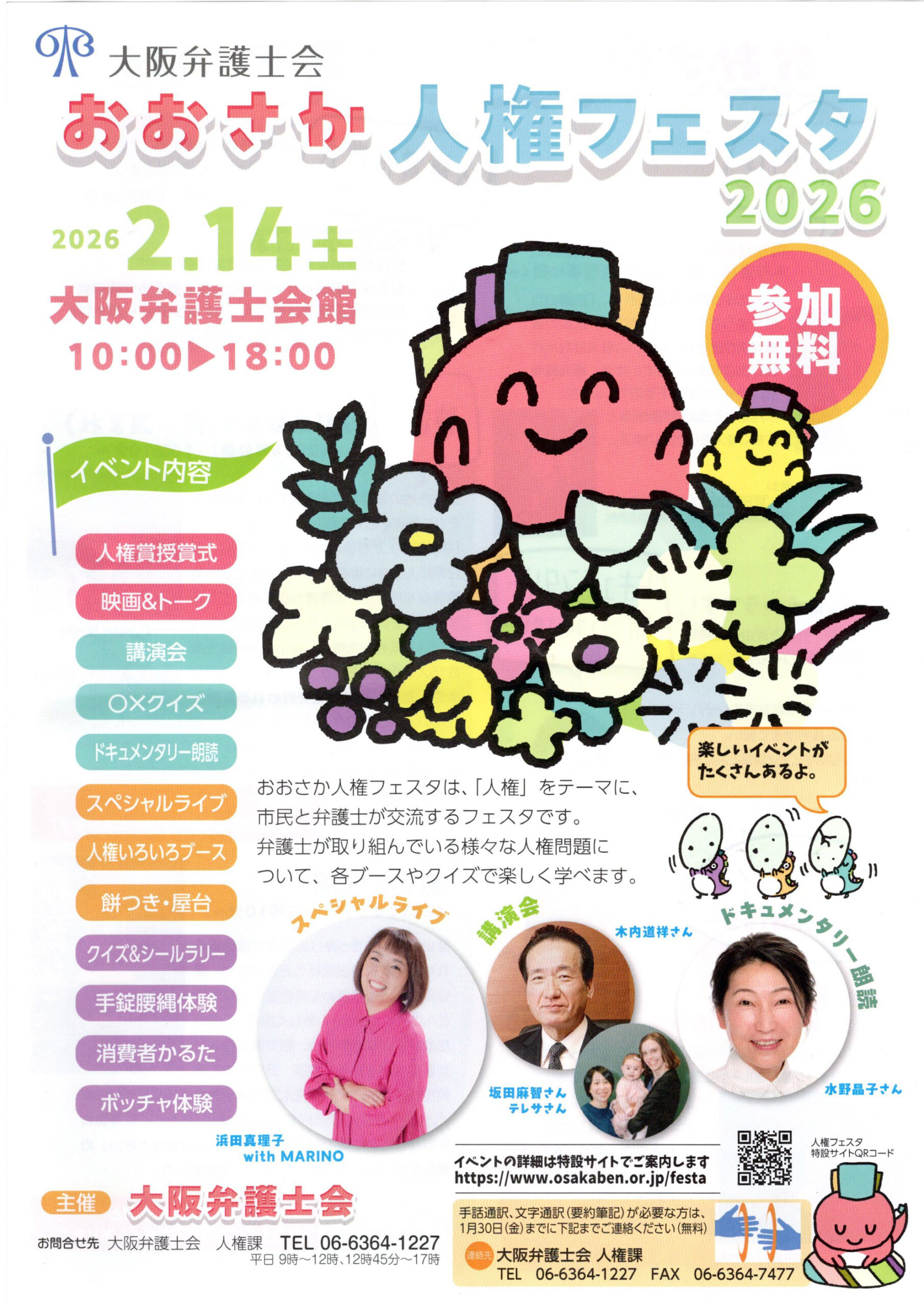 とりくみ案内 大阪弁護士会「おおさか人権フェスタ」2026 2026.02.11 ◆日時 2月14日(土)大阪弁護士会館 10:00~18:00◆イベント内容は掲載ビラおよびHPからご参照してください・◆参加無料です。 (印刷用PDFファイル)