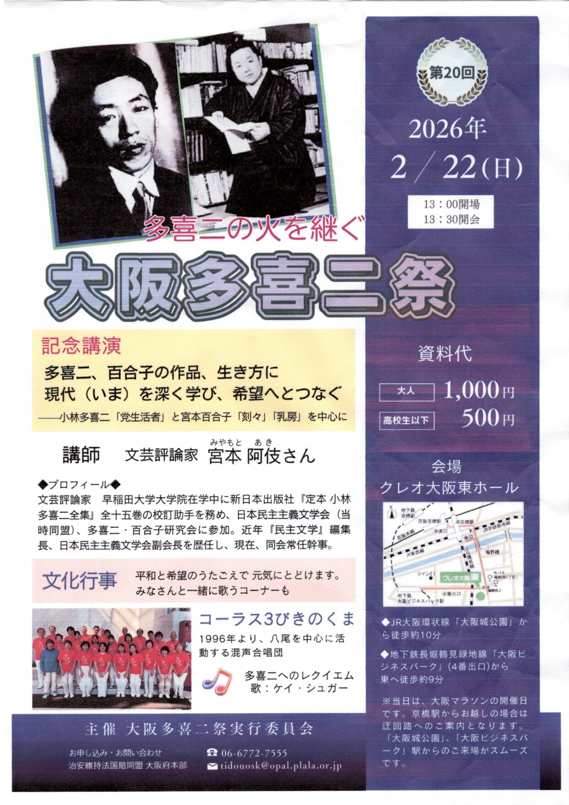 とりくみ案内 2026年 大阪多喜二祭 2026.02.11 ◆日時 2月22日(日)13:00開会 13:30開会 クレオ大阪東ホール◆《記念講演》文芸評論家 宮本阿伎さん 「多喜二、百合子の作品、生き方に現代(いま)を深く学び、希望へとつなぐ」◆《文化行事》コーラス3びきのくま 等◆《資料代》1,000円 (高校生以下500円) (印刷用PDFファイル)