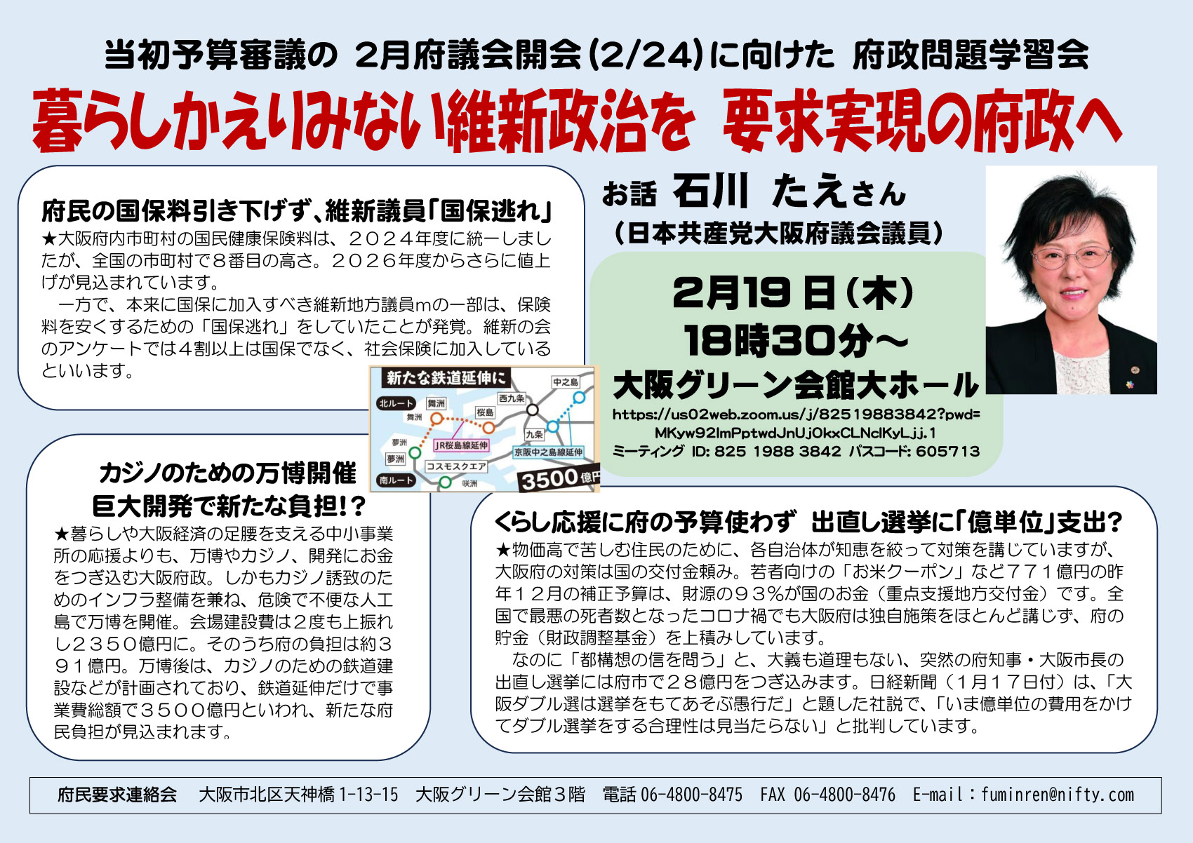 とりくみ案内 2月府議会開会(2/24)にむけた府政学習会 2026.02.11 ◆日時 2月19日(木) 18:30~ 大阪グリーン会館 (ZOOMオンライン併用)◆お話 石川たえさん(日本共産党府議会議員) 「暮らしかえりみない維新政治を 要求実現の府政へ」 (府議会開会日宣伝 2月24日(火) 午前8時30分~9時 府庁別館北側周辺) (印刷用PDFファイル)