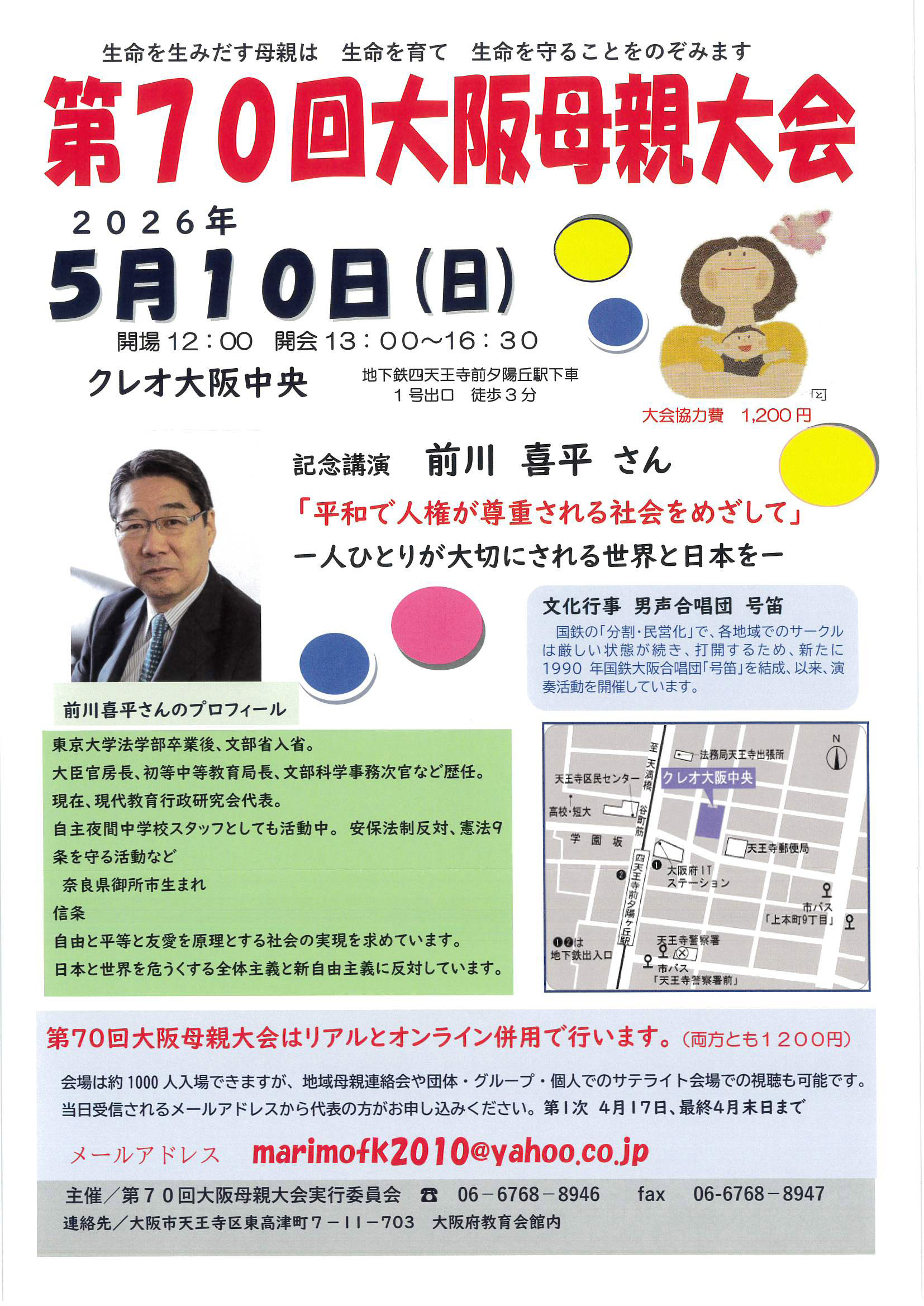 とりくみ案内 第70回大阪母親大会 2026.03.10 ■2026年5月10日(日)12:00開場 開会13:00~16:30■会場 クレオ大阪中央■記念講演:前川 喜平さん 「平和で人権が尊重される社会名座して」 ~一人ひとりが大切にされる世界と日本を~ (印刷用PDFファイル)