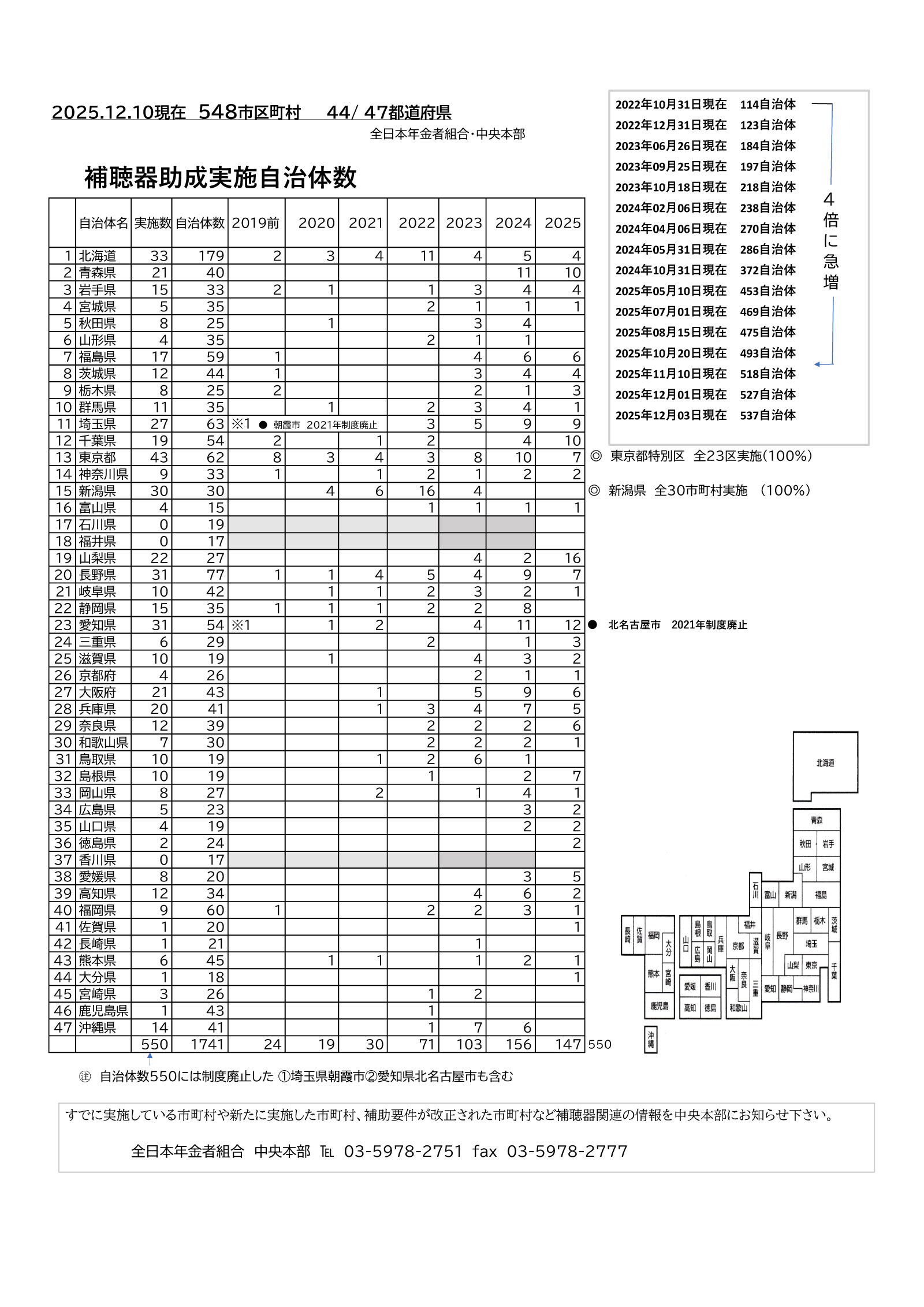 補聴器助成自治体数一覧表(2025.12.10現在)
